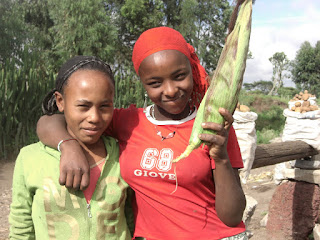 Je eet met z`n allen van een bord. Een groot bord wordt op tafel gezet, met bijvoorbeeld vier mensen erom heen (met hoeveel je bent gekomen). Het liefst zitten ze aan een laag tafeltje op lage krukjes. Jong, oud, modern, traditioneel, het gebeurt overal. Je eet ook allemaal met je handen, dus die ga je wel eerst even wassen. Nou eigenlijk eet je alleen met je rechterhand, de linker is voor de andere dagelijkse dingen ;). Je scheurt een stuk injera (pannenkoek van teff) af en pakt daarmee wat saus, vlees of (schaars!) groente. Als teken van vriendschap kan je soms een hapje eten bij iemand anders in de mond doen. Maar let op ! Dat moet je niet maar een keer doen, dat is te vrijblijvend. Nee altijd twee maal, dat laat zien dat het echt vriendschap is! Bij de traditionele injera-maaltijd wordt vaak een groene peper gelegd. Die heb ik tot nu toe altijd laten liggen, de rest is me vaak al pittig genoeg. Gelukkig kan ik dat gerust doen als vrouw. Voor mannen geldt echter dat ze die wel op moeten eten, anders worden ze gezien als zwak of meisjesachtig :P