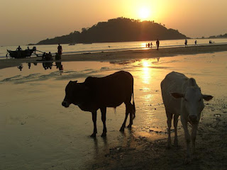 Blauwe zee, met een groen eilandje voor de kust. Een baai omlijnt door palmbomen. Relatief veel witte westerse mensen op het strand. Ik ben verbaasd als ik blote schouders zie en zelfs mensen in bikini. s Ochtend hardlopen langs de vloedlijn. s Avonds dobberen in de zee terwijl de zon ondergaat boven de zee en de maan te voorschijn komt. Bij kaars-en maanlicht dineren met een Sandeep (vriend uit Pune) aan het strand. Goede gesprekken en een rijpe ananas eten... mmm! Wie ben ik dat ik hier mag zijn, genietend!