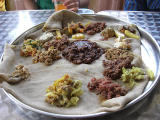 Je eet met z`n allen van een bord. Een groot bord wordt op tafel gezet, met bijvoorbeeld vier mensen erom heen (met hoeveel je bent gekomen). Het liefst zitten ze aan een laag tafeltje op lage krukjes. Jong, oud, modern, traditioneel, het gebeurt overal. Je eet ook allemaal met je handen, dus die ga je wel eerst even wassen. Nou eigenlijk eet je alleen met je rechterhand, de linker is voor de andere dagelijkse dingen ;). Je scheurt een stuk injera (pannenkoek van teff) af en pakt daarmee wat saus, vlees of (schaars!) groente. Als teken van vriendschap kan je soms een hapje eten bij iemand anders in de mond doen. Maar let op ! Dat moet je niet maar een keer doen, dat is te vrijblijvend. Nee altijd twee maal, dat laat zien dat het echt vriendschap is! Bij de traditionele injera-maaltijd wordt vaak een groene peper gelegd. Die heb ik tot nu toe altijd laten liggen, de rest is me vaak al pittig genoeg. Gelukkig kan ik dat gerust doen als vrouw. Voor mannen geldt echter dat ze die wel op moeten eten, anders worden ze gezien als zwak of meisjesachtig :P
